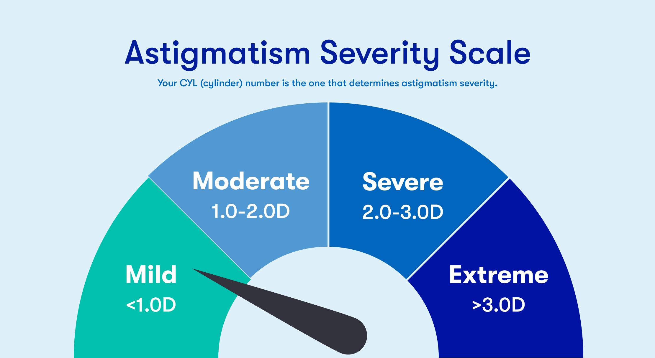 The astigmatism severity scale has three levels: mild, moderate, and extreme (high). Three components determine exactly how severe your astigmatism is: