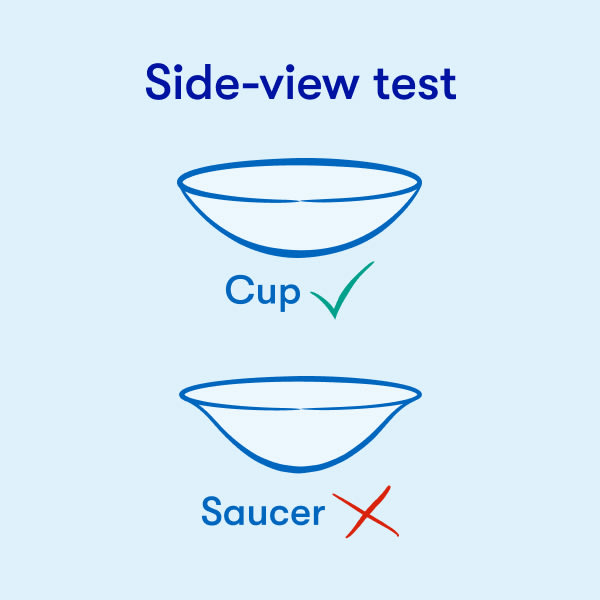 Side-view test. Place the contact lens on the tip of your finger and take a close look. A right-side out contact looks like a cup or slightly stretched letter "U", with the edges pointing straight up. An inside-out lens has edges that curl slightly outward, similar to a saucer. The distinction can be subtle, so go ahead and turn it inside out a few times until you can see the difference.