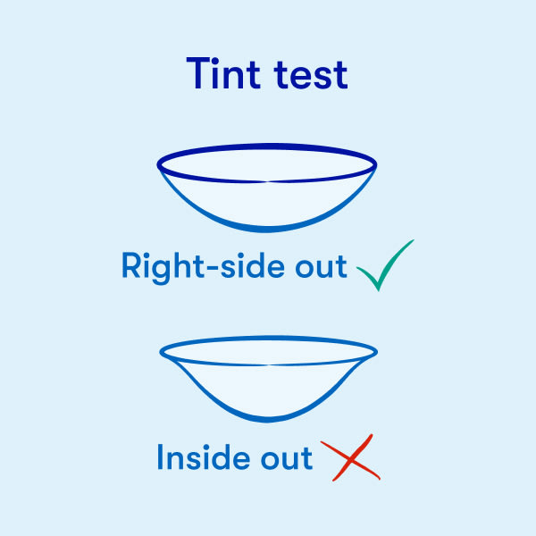 Tint test. Some manufacturers know the struggle is real and add tint so you know if your contact is inside out. We're not talking about colored contact lenses that make your brown eyes blue, but a hint of color, usually on the lens rim. The tint is slightly bolder if the lens is right side out than if it's not.