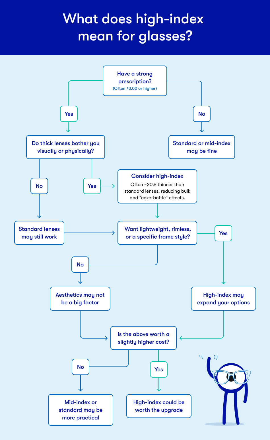 Increased costs: You may pay more for higher index lenses. For example, when comparing standard vs. mid-index vs. high-index glasses, you can expect average prices to increase as the index does.