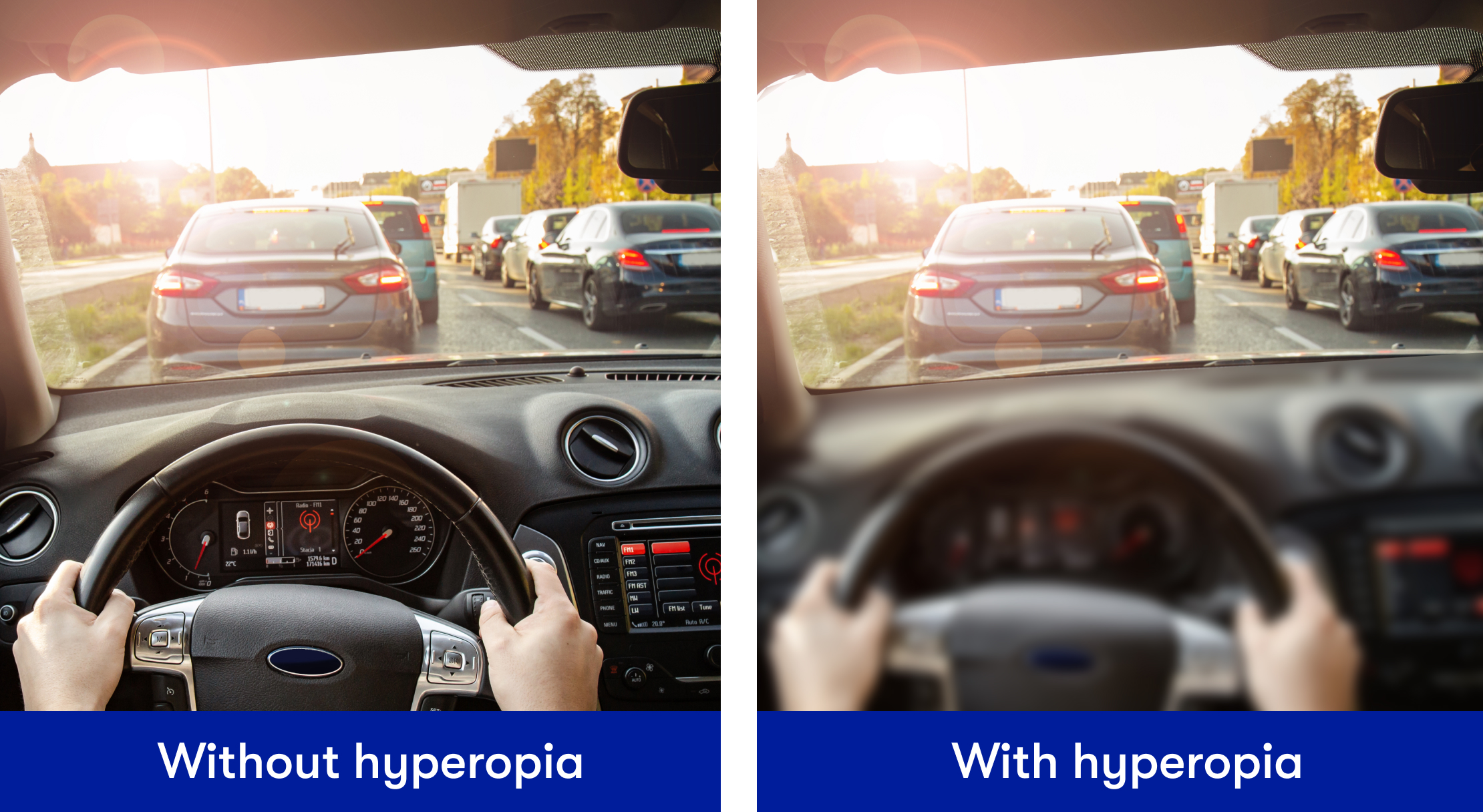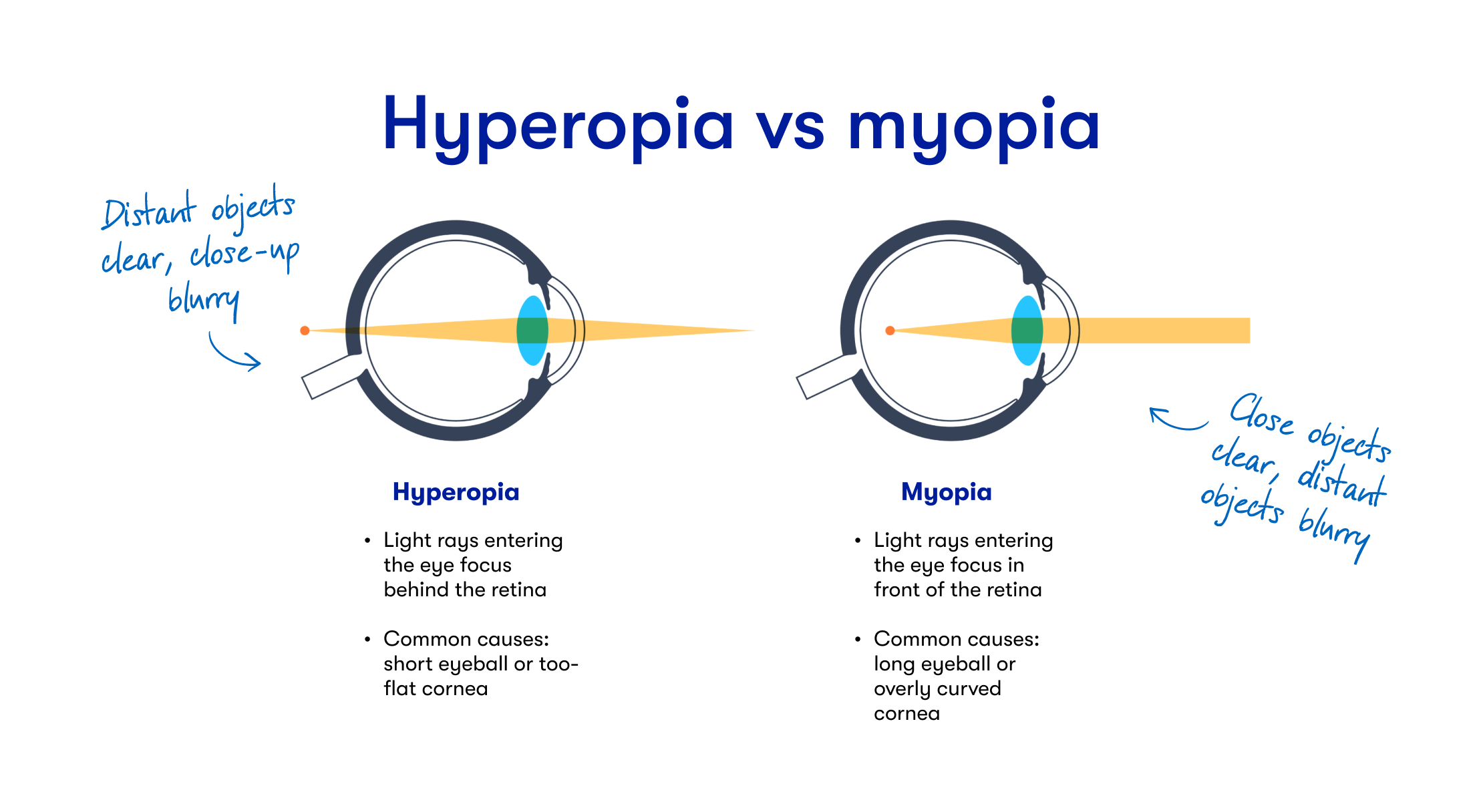 Farsightedness, or hyperopia, is an eye condition where you can see distant objects clearly, but objects close to you appear blurry. It happens if your eyeball isn't long enough from front to back or when your lens or cornea — the front surface of your eye — doesn't have enough of a curve. These issues cause light to focus behind the tissue at the back of your eye (also called your retina) instead of on it.